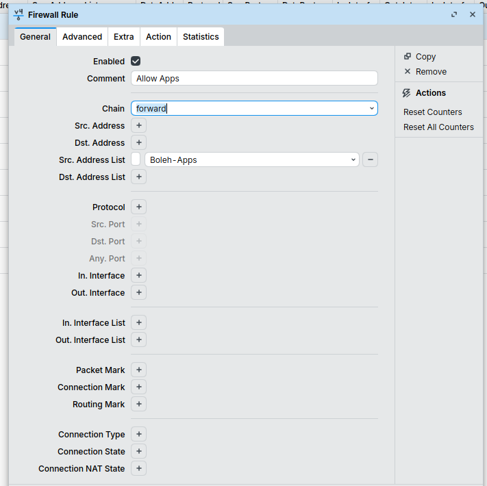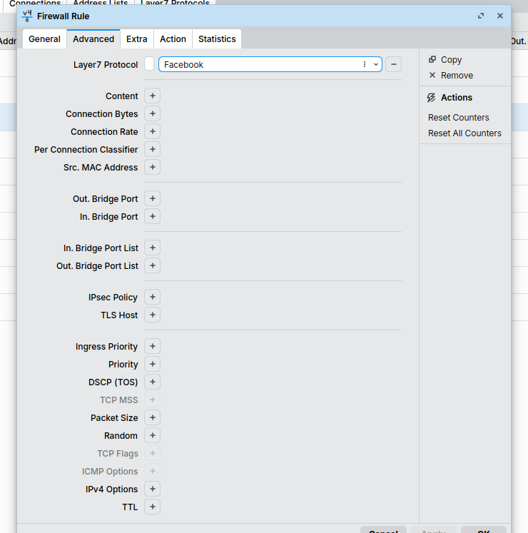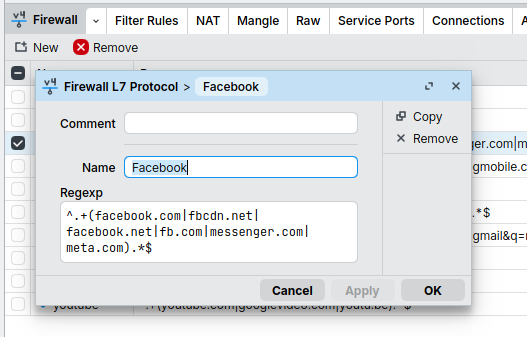 Sekarang saatnya kita buat rule untuk menjatuhkan paket data yang terdeteksi sebagai trafik Facebook, Instagram, atau TikTok.